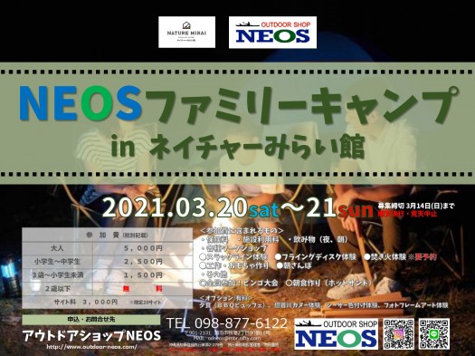 NEOSファミリーキャンプinネイチャーみらい館・2021年3月20日(土)~21日(日)/受付開始は2/22月より